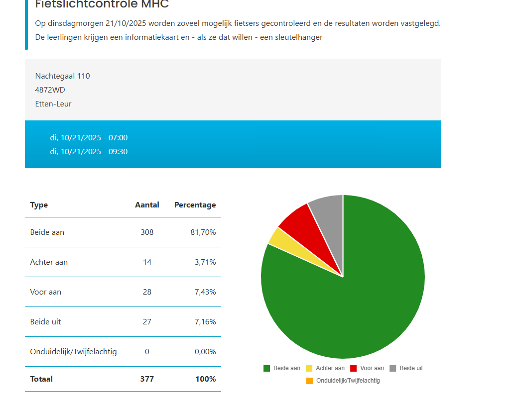 Dit jaar – 2025 - had 81,7 % van de fietsen voor en achter verlichting. Bij 7,2 % van de fietsen konden de lichten niet aan of onduidelijk. In 2024: 322 fietsen gecontroleerd. 69.55 goed, 10.58 voor en achter beiden uit.