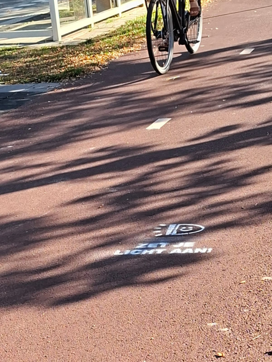 De tekst ZET JE LICHT AAN bij diverse fietspaden, toegangswegen en fietspaden Op vele plaatsen zijn ze door een team van vrijwilligers vanuit Veilig Verkeer Nederland afdeling Valkenswaard al gespoten en de rest volgt voor 26 oktober (ingang van de wintertijd),